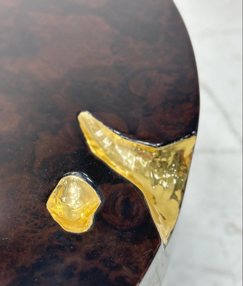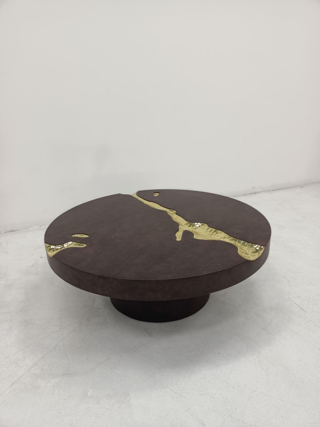 Material: Solid wood + brass Elevate Your Living Space: The Art of Convergence   Design Philosophy: Where Nature Meets Alchemy • Material Symphony: The table’s circular top is carved from sustainably sourced solid wood, selected for its dense grain and durability. The surface is finished with a low-luster sealant that enhances the wood’s tactile warmth while resisting moisture and scratches . • Gilded Fractals: The "cracked" brass inlays are achieved through a proprietary metallurgical process. Molten brass is carefully poured into fine, intentional fissures on the wood’s surface, then polished to a soft luster. This technique ensures each vein is unique where imperfections become strengths . • Architectural Silhouette: The table stands on a gently tapered wood base, inspired by mid-century Danish craftsmanship. Its slender proportions create an illusion of lightness, allowing the design to anchor a space without overwhelming it . Curated Moments: The Table in Its Element Imagine this piece as the heart of your living room:   • A Sanctuary for Solitude:Place a ceramic mug on its surface, and watch how the wood’s earthy tones complement the brass’s warmth—a daily reminder that luxury lies in harmony, not excess . • Adaptable Legacy: Its neutral palette and sculptural presence allow it to blend seamlessly with minimalist, industrial, or Bohemian interiors. Pair it with a velvet sofa to highlight its organic elegance, or contrast it with concrete walls for an edgy, gallery-like vibe . The Owner’s Journey: Beyond Aesthetics • Emotional Resonance: This table is designed to evolve with you. Over years, the wood will develop a deeper patina, while the brass acquires a subtle antiquity—each change telling a story of shared moments and quiet growth . • Functional Poetry: Beyond beauty, it offers practicality. The solid wood construction ensures stability for everything from stacked art folios to a temporary workstation. The polished brass is treated to resist tarnishing, maintaining its brilliance with minimal care . • A Legacy of Consciousness: We prioritize ethical sourcing and traditional techniques, ensuring that every piece is not only beautiful but also responsible. This is furniture for those who value provenance over trends .  |