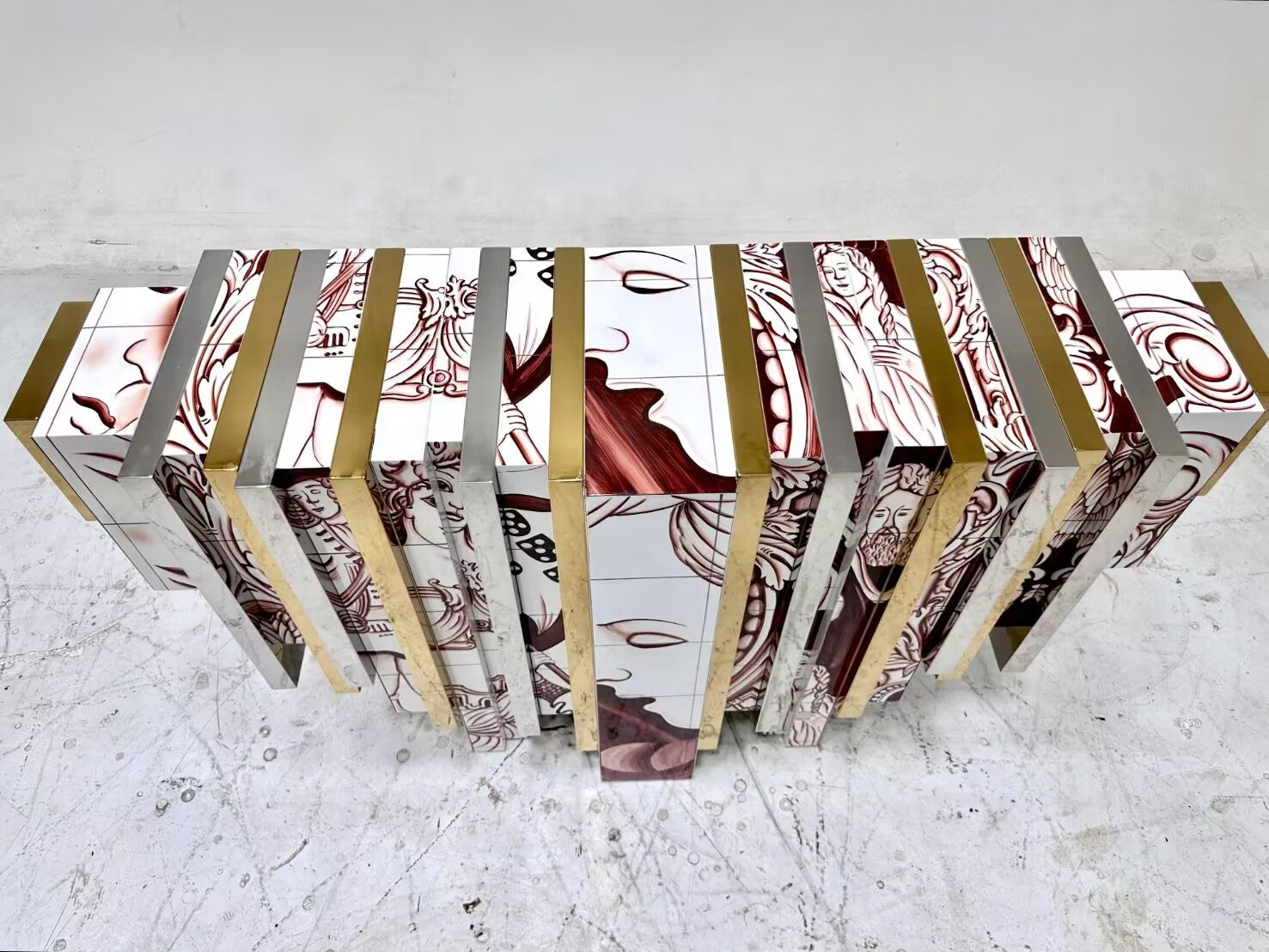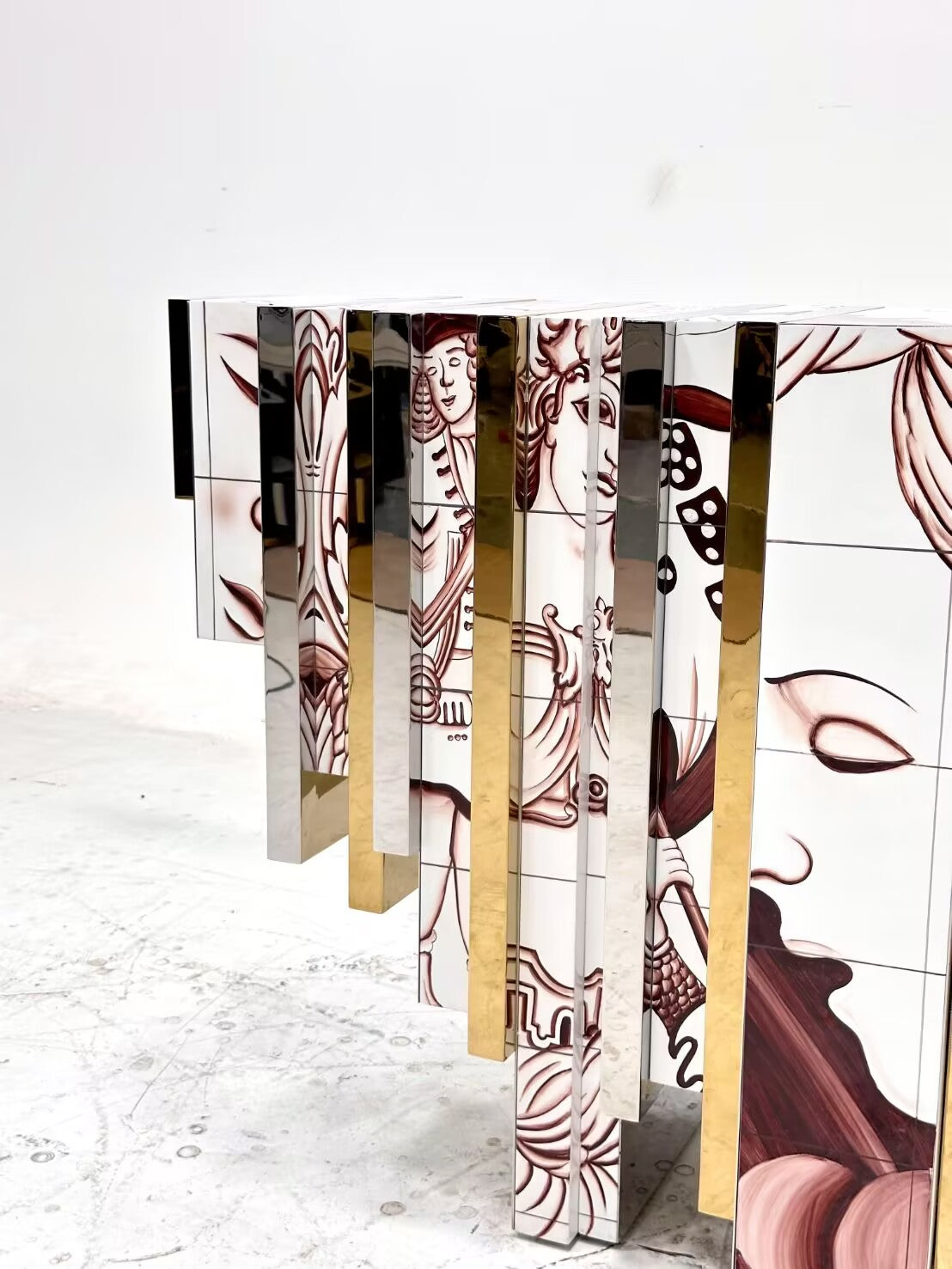 Material: Solid wood + glass + brass + tile Elevate Your Entryway: A Portal to Heritage and Modern Luxury   Design Philosophy: Where Legacy Meets Avant-Garde • Narrative Tiles: Every hand-painted scene captures Portugal’s Age of Discoveries, rendered in cobalt blues and terracotta hues reminiscent of Lisbon’s azulejos. These aren’t mere decorations,they’re heirlooms that turn a functional surface into a conversation starter . • Modular Solid wood structure: Reconfigurable timber blocks allow you to stack, extend, or compartmentalize. Use them as a console for keys, a display for sculptures, or a mini-bar for evening apertifs—their versatility mirrors the fluidity of modern living . • Polished Brass & Mirrors: The brass’s warm luster contrasts with the mirror’s cool clarity, creating a dialogue between opulence and illusion. The beveled edges aren’t just decorative; they manipulate light to erase spatial boundaries, ideal for compact urban dwellings . Curated Spaces: Beyond the Ordinary • The Collector’s Gallery: Pair it with a velvet bench and a spotlight to highlight the tiles’ artistry. The mirror becomes a functional tool for last-minute appearance checks while amplifying the visual depth of your curated art wall .   Why It Transcends Trends This piece isn’t just furniture; it’s an heirloom in the making. The tiles celebrate artisanal patience, the brass ages to a cherished patina, and the modularity ensures it evolves with your life. In essence: A symphony of Portuguese soul, brass boldness, and optical magic—this is where first impressions become lasting legacies.  |
