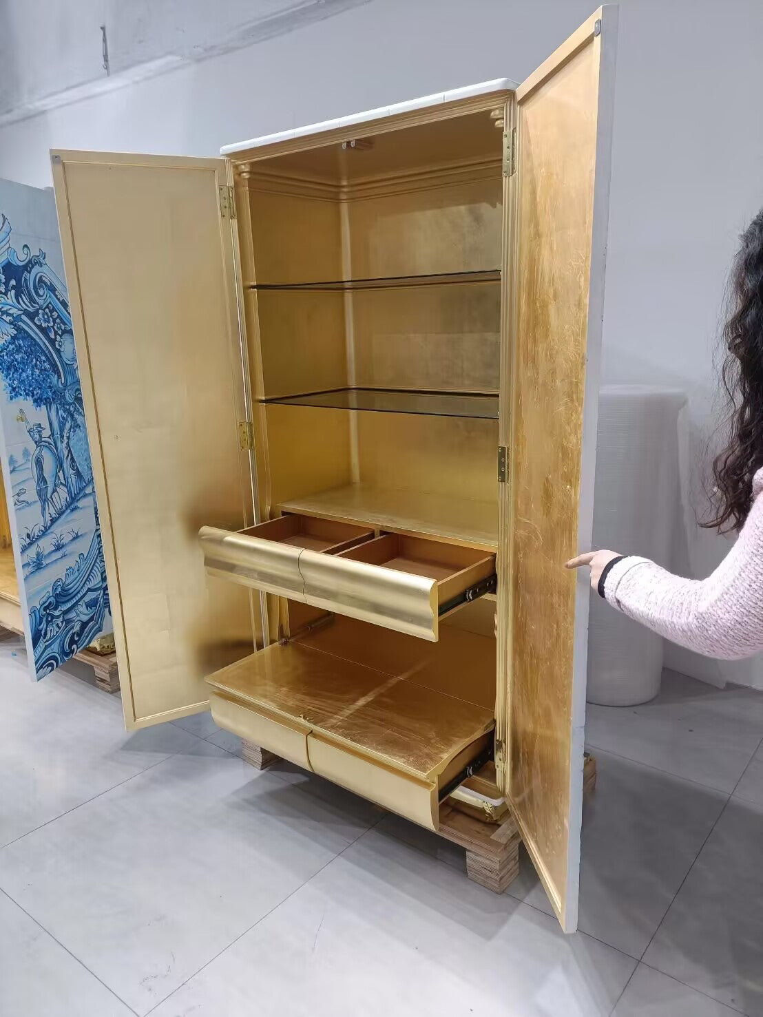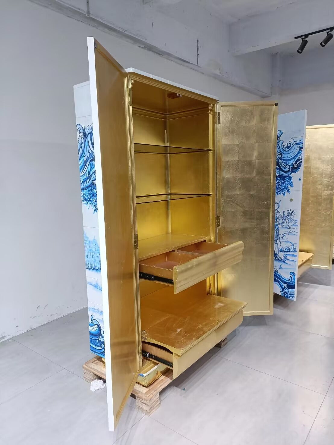 Material: Solid wood + ceramic tile + brass Elevate Your Dining Space: A Symphony of Porcelain Artistry and Gilded Luxury In a world where functionality often overshadows artistry, this sideboard emerges as a testament to the harmonious marriage of timeless craftsmanship and modern sophistication. Designed for those who refuse to compromise between aesthetic grandeur and everyday utility, it transforms the dining area into a curated gallery of refined living. Design Narrative: Where Heritage Meets Avant-Garde • Celestial Blue on Porcelain: The exterior is adorned with hand-painted blue-and-white porcelain tiles, a technique inspired by centuries-old Qinghua ceramic artistry . Each tile tells a story of delicate brushstrokes and mineral-rich cobalt pigments, evoking the serenity of Chinese landscape paintings while lending a crisp, gallery-like elegance to your space . • Gilded Interior Splendor: Behind the ornate doors lies a surprise—a warm, luminous interior lined with 24K gold leaf. This juxtaposition of cool porcelain and radiant gold creates a dramatic reveal, turning the simple act of retrieving a wine glass into a moment of opulence . • Sculptural Base in Hammered Brass: The foundation, crafted from hand-hammered brass, introduces an organic texture reminiscent of artisanal metalwork. Its asymmetrical patina and subtle irregularities celebrate the beauty of human touch, while providing steadfast stability . • Functional Poetry: Two tempered glass shelves float within the cabinet, offering discreet storage for crystal stemware or heirloom china. Their transparency ensures the gold-leaf interior remains visible, amplifying light and creating an illusion of expanded space . Curated Experiences: Beyond Mere Storage 1. The Connoisseur’s Gallery   2. The Effortless Host   3. A Daily Ritual, Elevated   Value Crafted for the Discerning Few • Spatial Alchemy: The cabinet’s reflective surfaces—gold leaf, glass, and brass—work in concert to amplify natural light, making compact dining areas feel airy and expansive. It’s a masterclass in balancing grandeur with spatial intelligence . • Enduring Legacy: This is not furniture for a season, but an heirloom destined to gather stories across generations. • Emotional Resonance: Beyond utility, it embodies a philosophy—where Eastern poise dialogues with Western grandeur, and every detail whispers of a life lived with purpose. For those who see their homes as an extension of their identity, this piece is a declaration of taste . In Essence: This is more than a storage solution; it is a bridge between eras, a canvas for self-expression, and a quiet revolution against the disposable. For those who demand that their surroundings reflect their inner world, it offers a sanctuary where beauty is not just seen but felt .  |