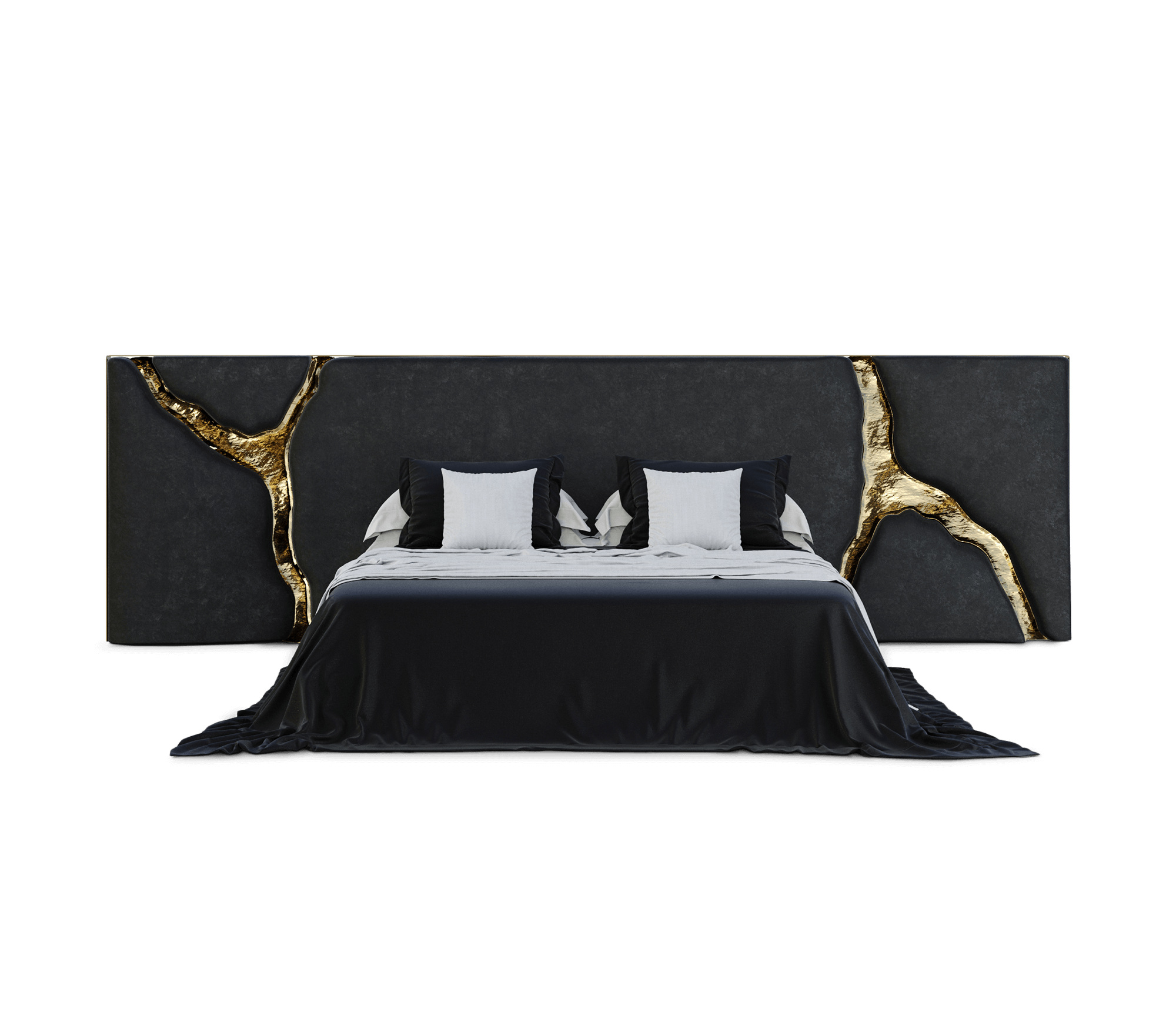 In the realm of nocturnal opulence, this creation emerges as a chiaroscuro masterpiece—where the depth of black meets the audacity of gold. Cloaked in sumptuous Sanded leather, its surface whispers luxury under fingertips, while the sinuous veins of gilded dendritic motifs erupt like frozen lightning across the headboard.
