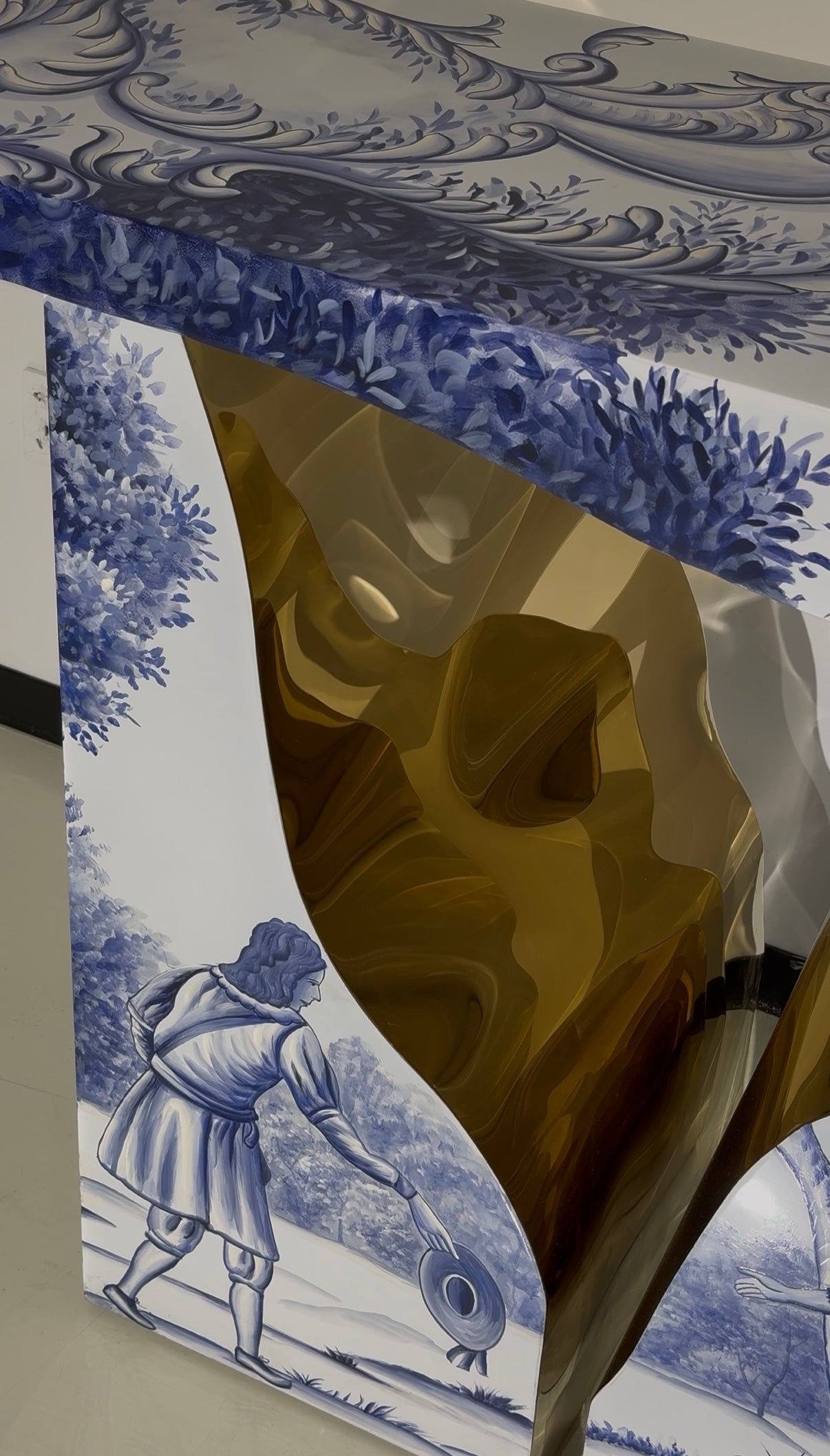 Material: 304 stainless steel + hand-painted The Lapiaz console exemplifies expert craftsmanship and innovative design, combining traditional Portuguese Azulejos tiles with luxurious materials. Hand-painted white and blue tiles adorn this contemporary piece, while a polished brass sheet, meticulously cracked, reveals a rich golden interior. Inspired by natural karst formations, this artistic console merges cultural heritage with modern aesthetics, offering an elegant and unique focal point for sophisticated interiors.  |