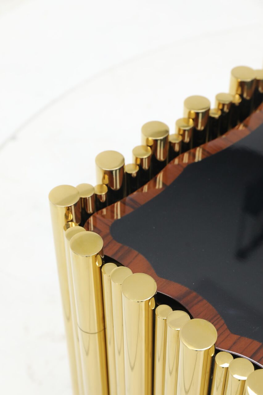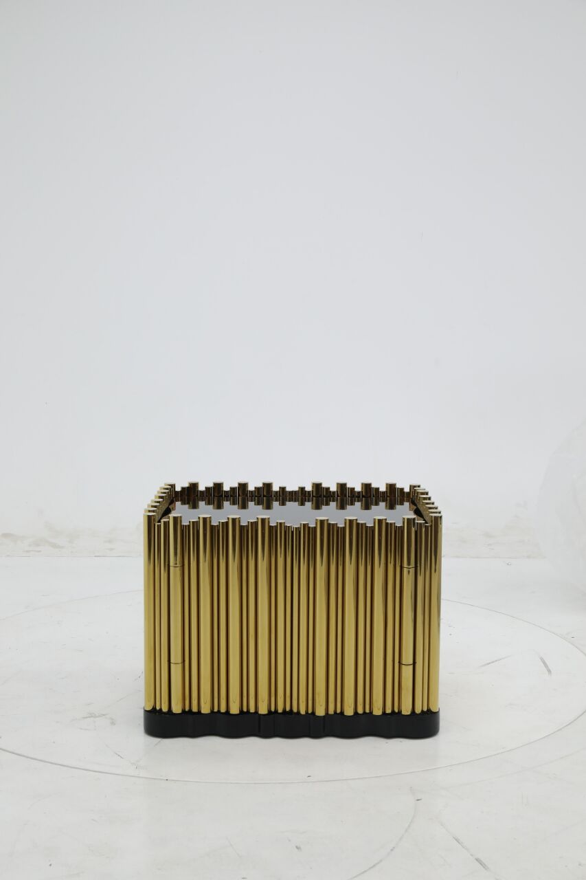 This striking bedside cabinet is a testament to the harmonious marriage of timeless craftsmanship and contemporary design. The bold juxtaposition of hand-polished brass tubes enveloping a solid wood body creates a visual dialogue between warmth and precision, while the matte black lacquered base grounds the piece with understated sophistication. The brass, meticulously aged to evoke a softly patinated glow, contrasts with the wood’s organic grain—each material celebrating its inherent texture yet unified in purpose.