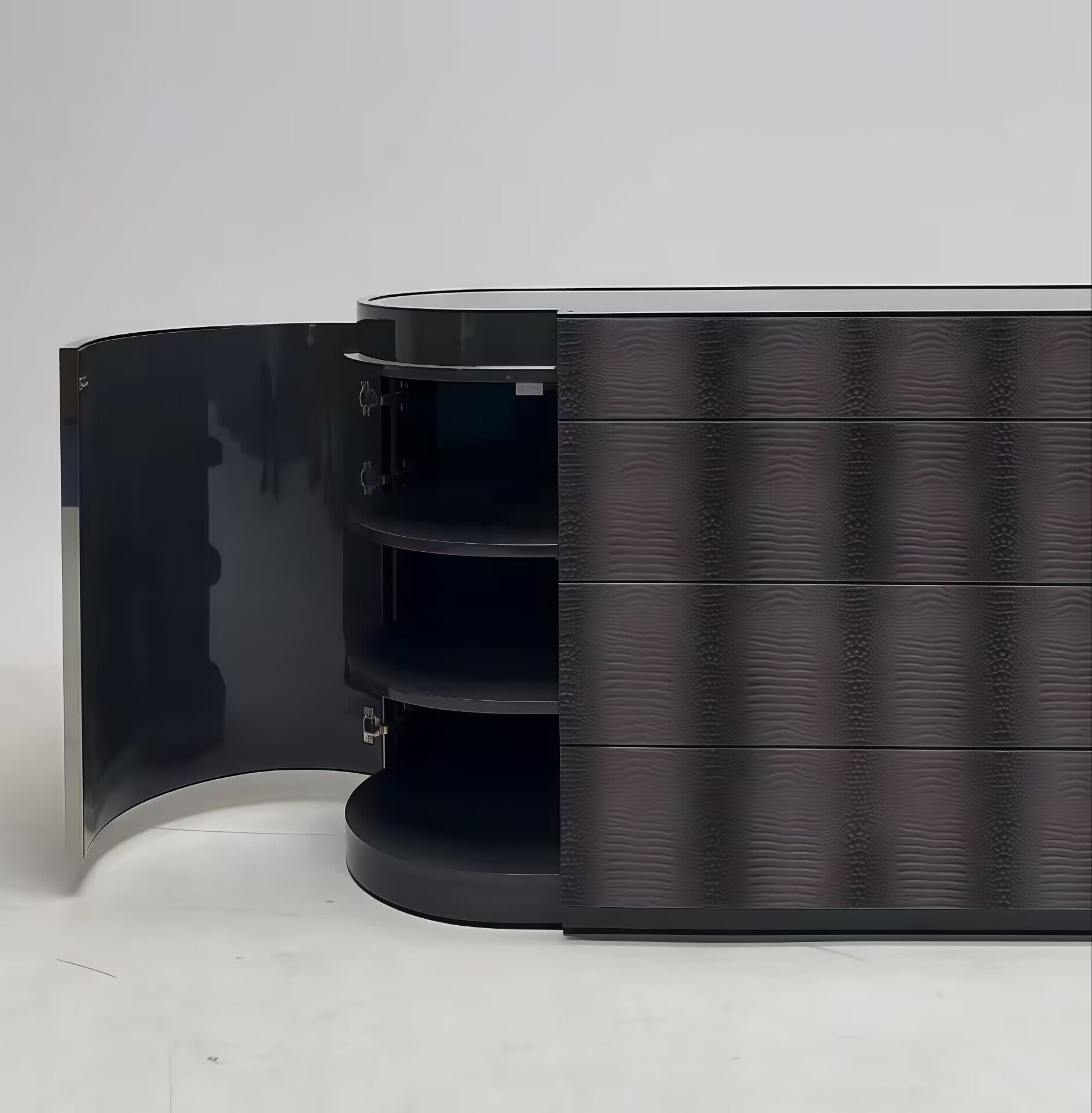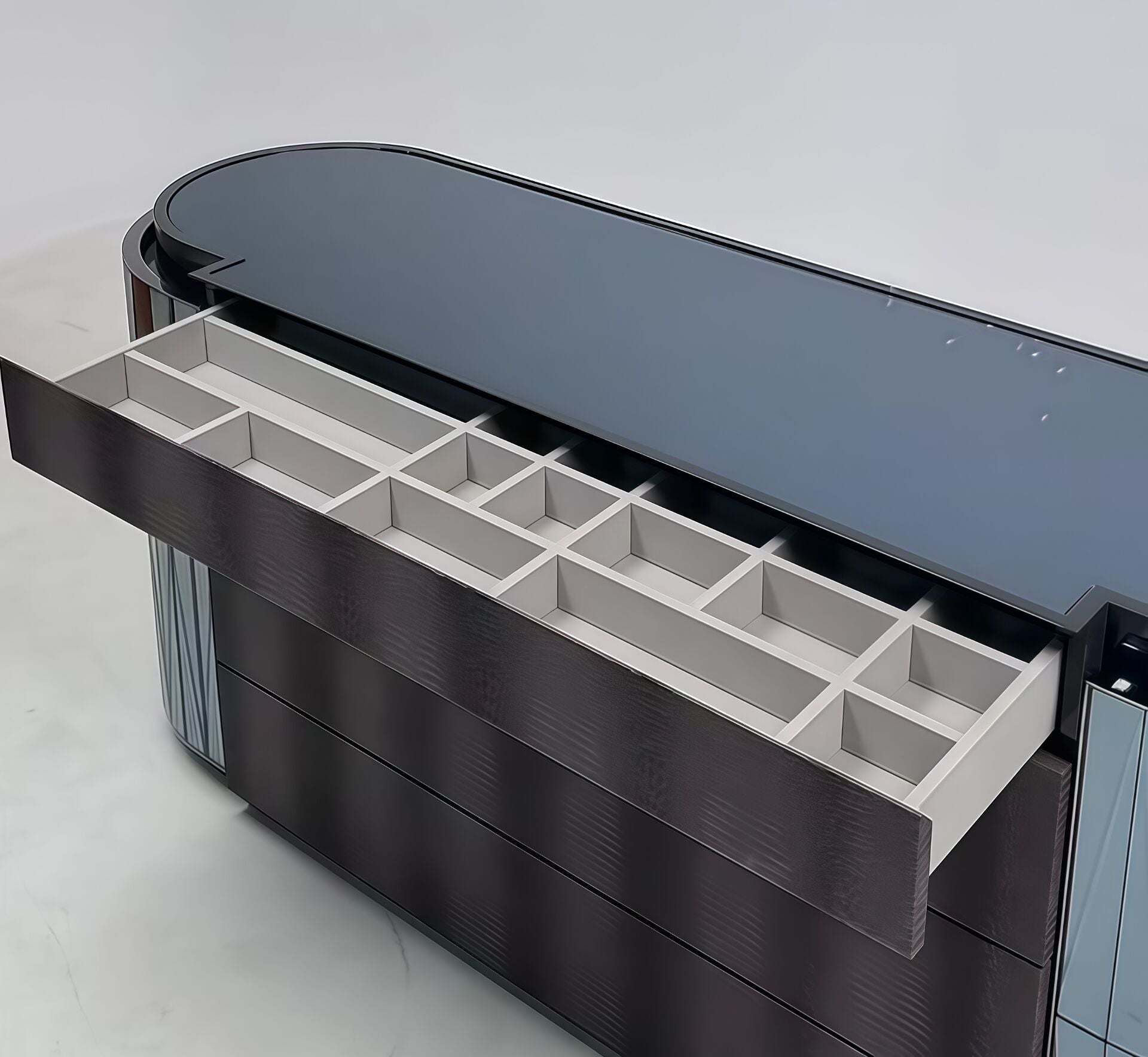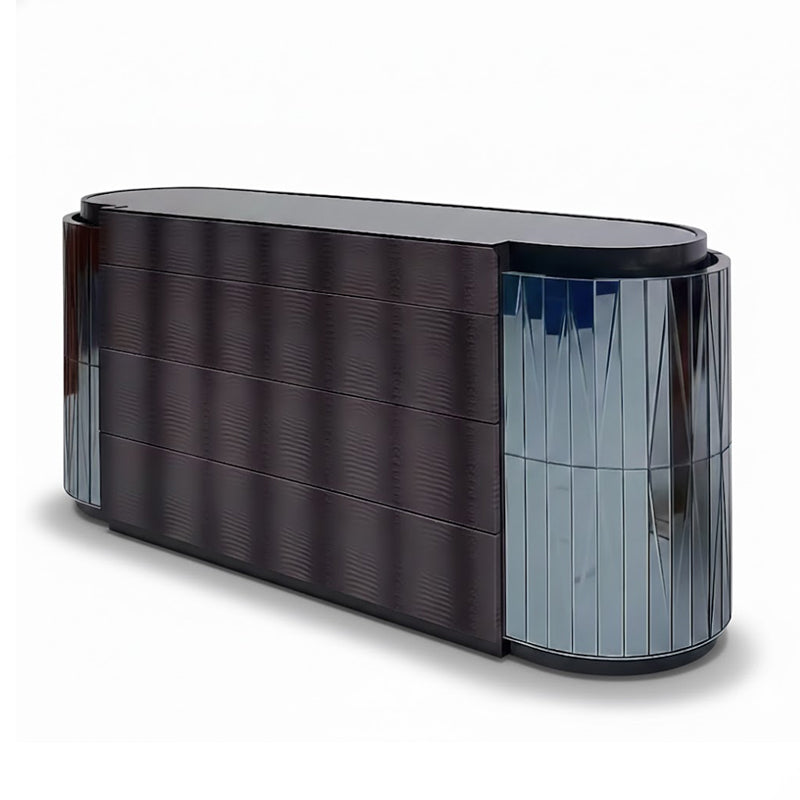Material: Solid wood + glass + leather Time Theater · A Symphony of Reality and Illusion In an era where space becomes an extension of personality, this cabinet is a statement, not merely a container. It draws inspiration from the eclecticism of the Victorian era and the dramatic tension of the Baroque, reshaping classical grandeur with a contemporary aesthetic language. This is furniture designed for those who dare to write epics in their living spaces – it's not just for storage, but for display, dialogue, and a poetic resonance between history and the present. Design Narrative: A Dialogue of Eras • Sculptural Silhouette: The oval body, derived from the Victorian era's preference for soft geometry, avoids the harshness of straight lines, outlining an inclusive silhouette with flowing curves. The meticulously carved concave details create soft transitions of light and shadow, paying homage to Baroque art's fascination with dynamism and depth. • A Duet of Materials: The mirrored surfaces on both sides not only capture and extend the light and scenery of the space but also echo the Baroque art's playful use of visual illusion. The metal frames and decorative details, with their exquisite finishing, outline the contours, creating a captivating interplay between reflection and substance, like gilded carvings in a classical hall, reborn in a modern context. • The Ritual of Order: The multiple drawers create a rigorous storage system beneath the opulent exterior. Every line and panel division has been carefully considered, integrating decorative and functional elements to ensure that the intricate beauty serves the orderly flow of life. Living Scenarios: The Art of Curating Everyday Life 1. Entrance Hall Overture 2. Salon Focal Point 3. A Private Sanctuary Shared Values of the Owner • Emotional Resonance: It transcends mere objects, becoming a transmissible vessel of emotion. Victorian romance and Baroque passion merge here, creating a dramatic atmosphere that transcends time. The mirror not only expands space but also metaphorically reflects on oneself and life. • Timeless Craftsmanship: Rejecting fleeting trends, it returns to solid structure and exquisite detail. The sturdy construction, precise joinery, and durable finishes ensure its longevity for generations. This is not only an investment in beauty but also a belief in a lifestyle that withstands the test of time. To the Discerning Eye: |